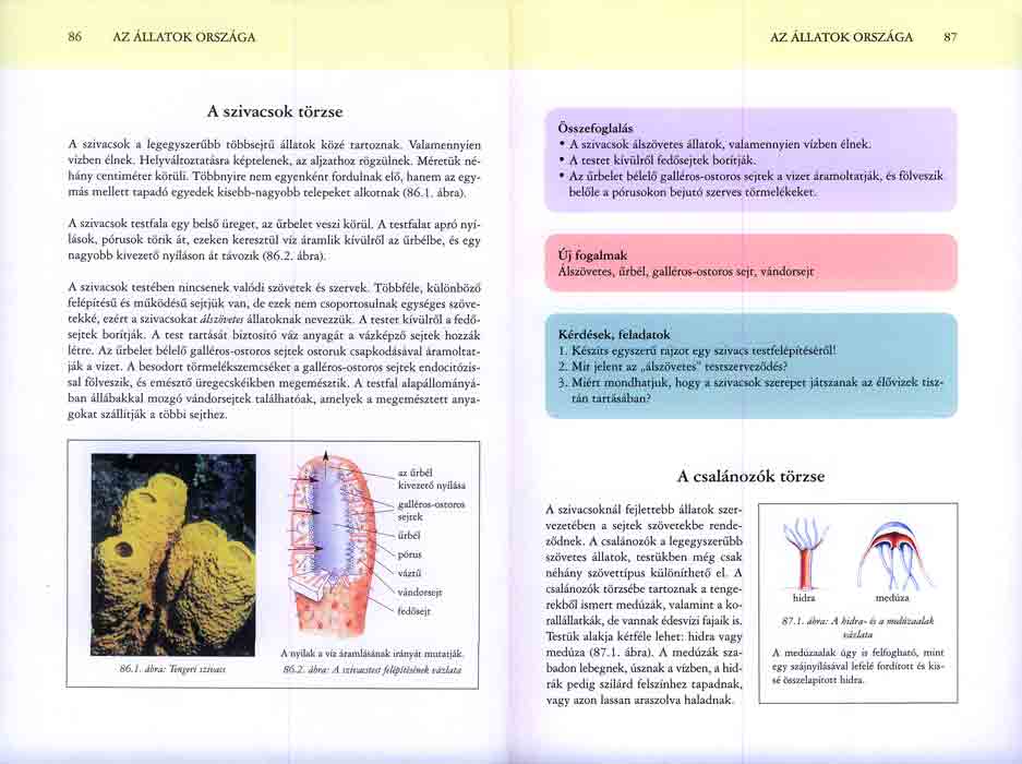 Az állatok országa Az állatok testszerveződése, szövetek Az állatok életműködései A szivacsok törzse A csalánozók törzse A laposférgek törzse A fonálférgek törzse A gyűrűsférgek törzse A puhatestűek törzse A csigák osztálya A kagylók osztálya A fejlábúak osztálya Az ízeltlábúak törzse A rovarok osztálya A rákok osztálya A pókszabásúak osztálya A tüskésbőrűek törzse A gerinchúros állatok törzsei A gerincesek törzse A halak osztályai A kétéltűek osztálya A hüllők osztálya A madarak osztálya Az emlősök osztálya Az állatok magatartása Az öröklött magatartásformák A tanult magatartásformák Az állatok társas viselkedése Az állatok kommunikációja |